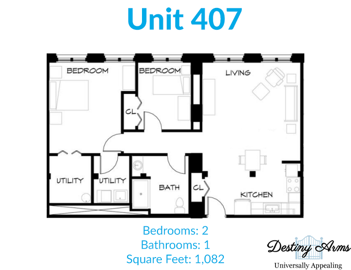 | 407 | 2 Bedroom | 1 Bathroom | 1,082 | Leased | View Floor Plans | 3D Tour | |
